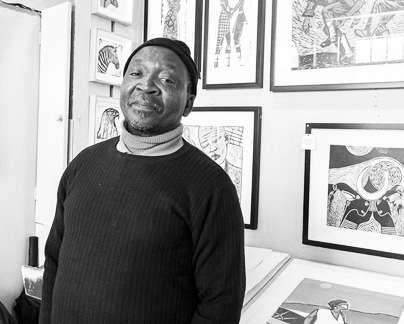 The South African artist Boyi Molefe works and presents his pieces at the V&A Waterfront in Cape Town, a central hub for art and design. With over 70 years of age, his work combines personal experience with cultural influences from South Africa.